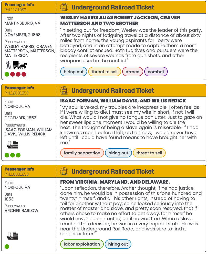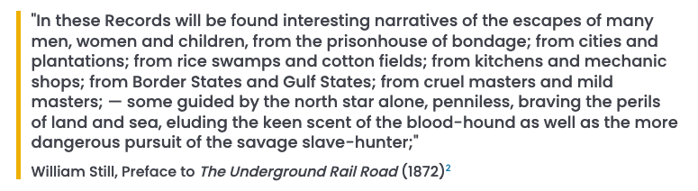 As chairman of the Vigilance Committee of the Pennsylvania Anti-Slavery Society and conductor on the Philadelphia Underground Railroad station, William Still recorded the "hardships, hair-breadth escapes, and death struggles" of nearly a thousand self-emancipators who traveled through the Philadelphia station. Almost three hundred of these freedom seekers were fleeing slavery in Virginia.
